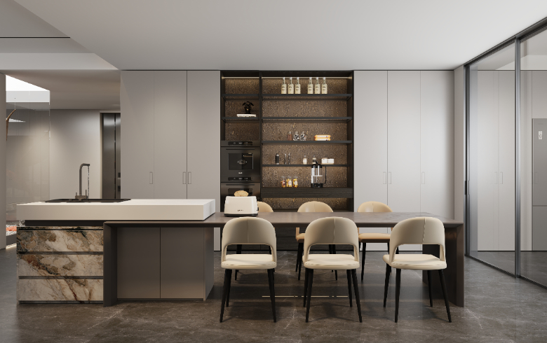客餐廳一體化設(shè)計(jì),空間開闊,視覺清爽。壁龕式內(nèi)嵌+玻璃柜+封閉柜,不占地兒,兼顧展示性與實(shí)用性;餐桌與島臺一體化設(shè)計(jì),擺放在餐廳,非常上檔次,瞬間提升居室的格調(diào),既節(jié)約了空間,也增加了可操作臺面區(qū)域,再多親友聚會社交都不怕。