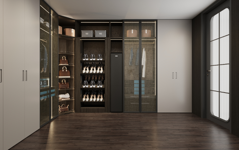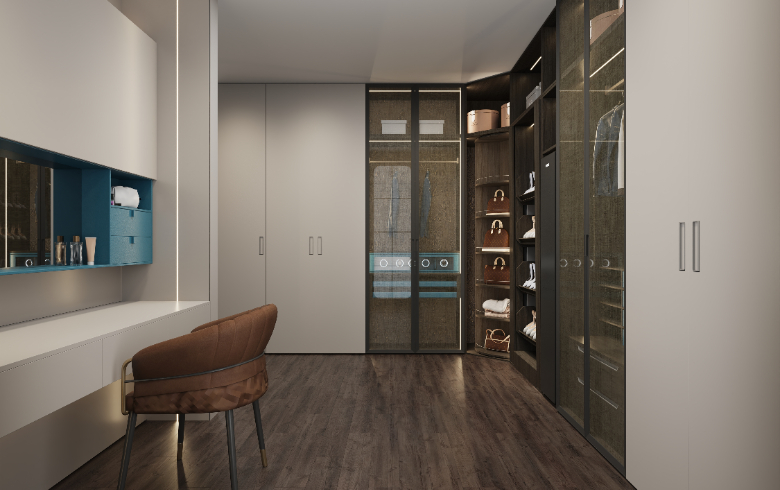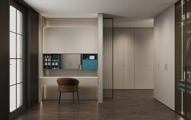 衣帽間設(shè)置梳妝臺,模塊化功能分區(qū),秩序井然,兼具實(shí)用性與視覺美,新穎別致的開放格設(shè)計(jì),滿足Amy放置常用的護(hù)膚化妝品。