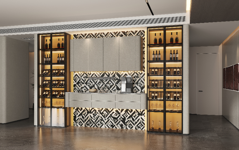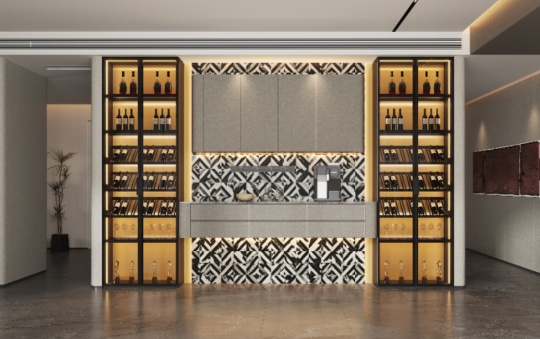 一字型餐酒柜,左右對(duì)稱(chēng),吊柜+中部鏤空區(qū),藏酒區(qū)與收納置物區(qū)兼得,3D打印裝飾畫(huà)背板融入隱形燈帶,調(diào)和視覺(jué),打造業(yè)主宅家社交場(chǎng)。