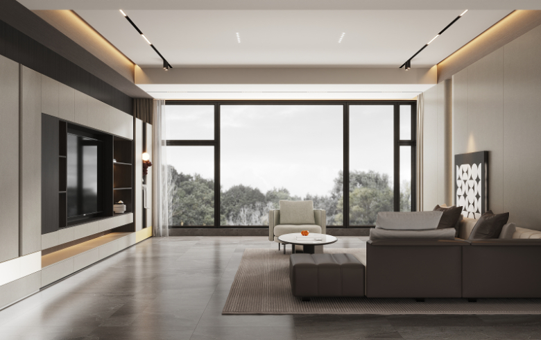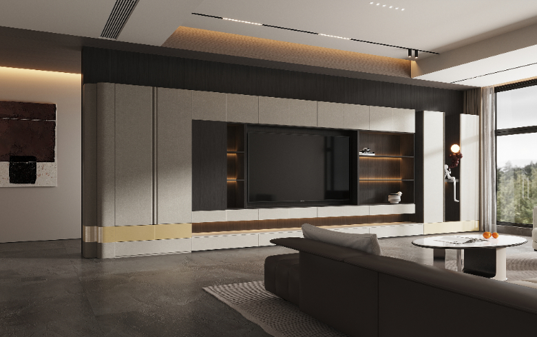 一字型滿墻電視柜,滿足收納與展示,視覺(jué)上更有連貫性。