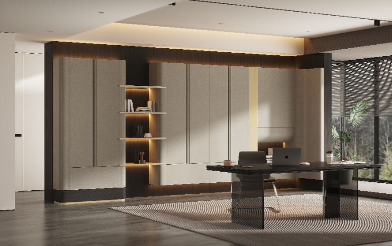 一側(cè)設(shè)計(jì)成懸浮書(shū)柜,輕盈時(shí)尚,打破整墻書(shū)柜的厚重壓抑感,讓學(xué)習(xí)工作更輕松有趣。