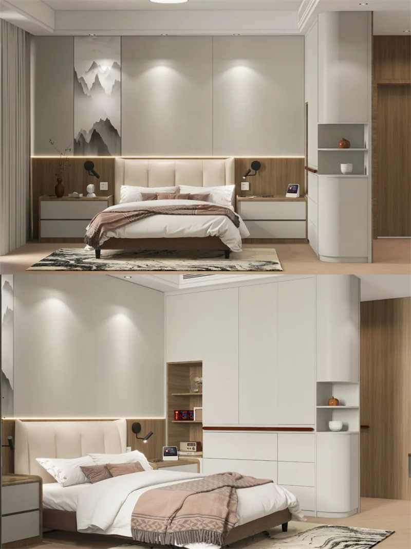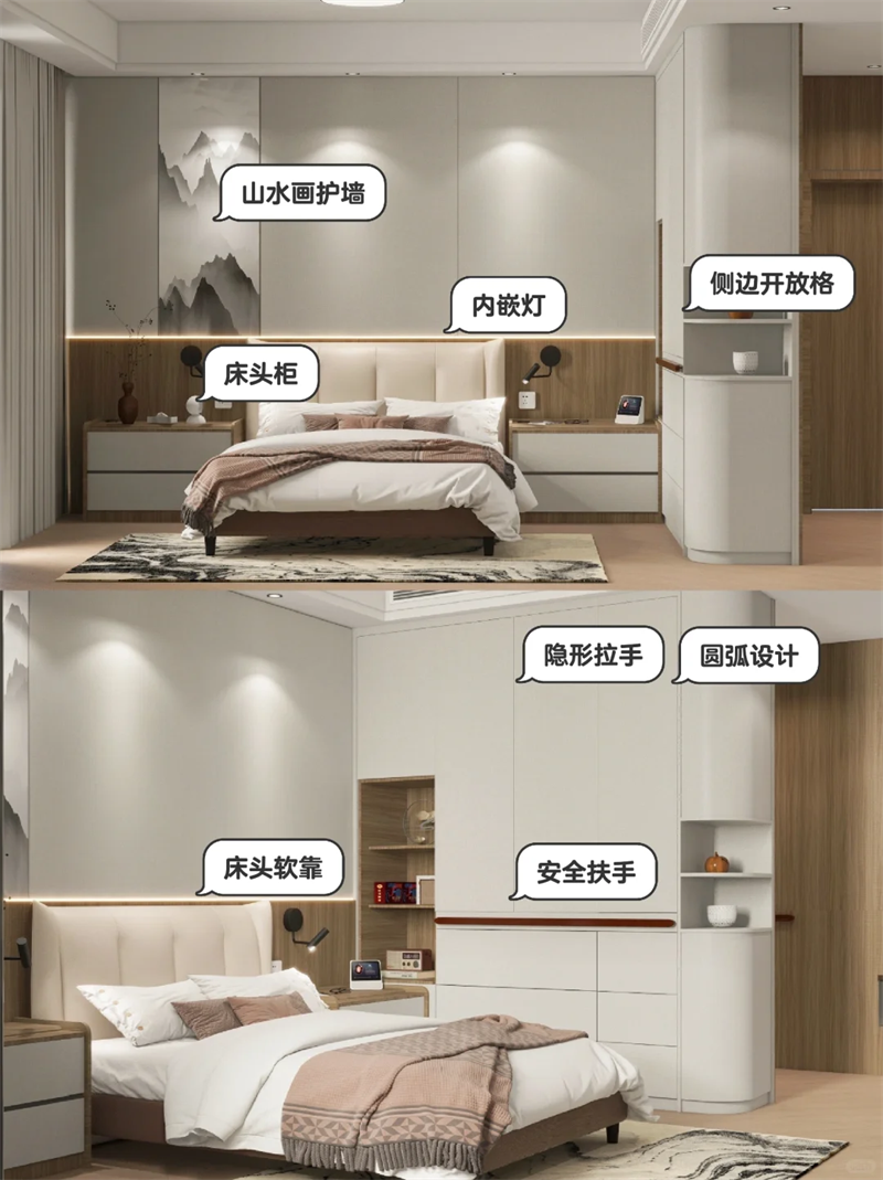 ??床頭護(hù)墻板融入山水畫,更符合爸媽審美,裝內(nèi)嵌感應(yīng)燈,方便夜間起床。