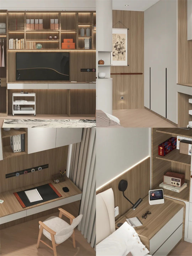 ??床尾選擇做衣柜+書桌柜一體化設(shè)計(jì),看書、練書法、看電視,在家悠閑樂(lè)享時(shí)光?