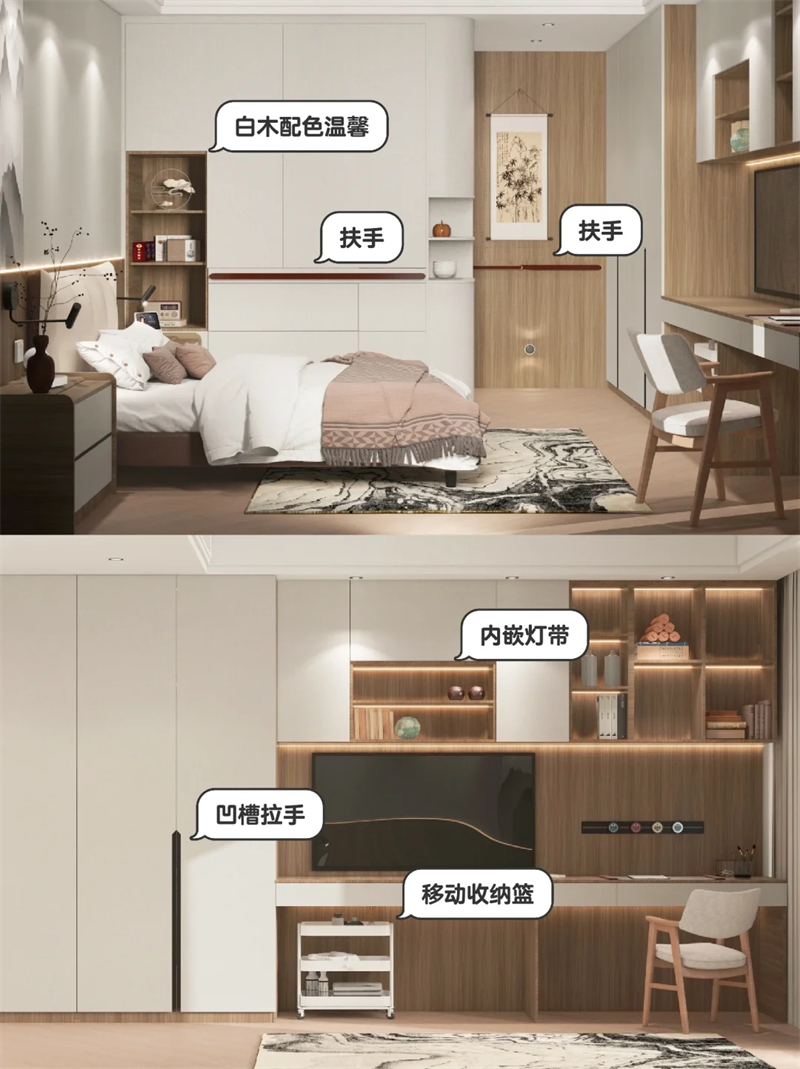 ??即使年輕人可能不選擇床頭柜,父母房間里一定要安排上,放置書、老花鏡、保溫杯等日常必需品~