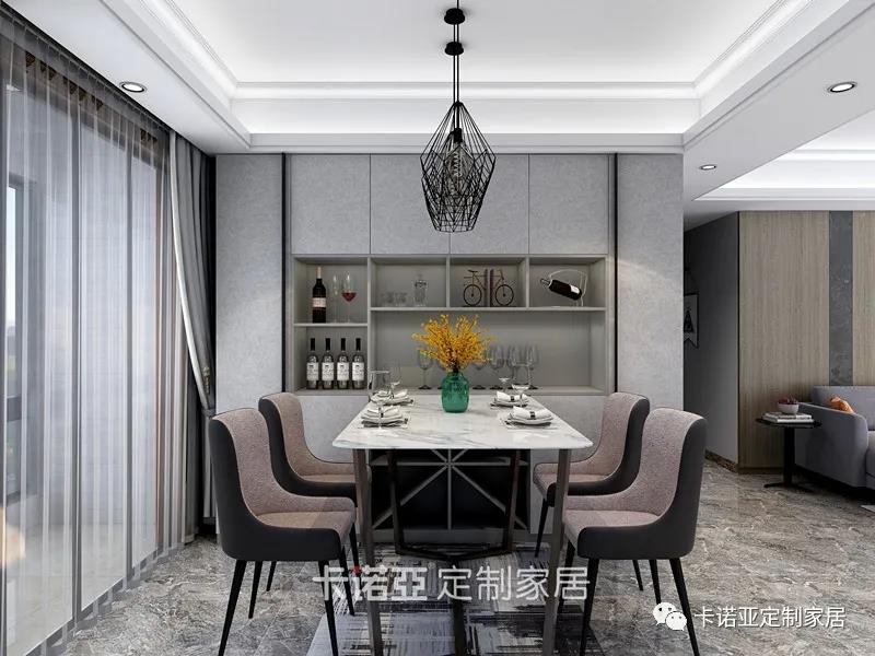灰色系和粉色兩種撞色,柔和的燈光讓用餐環(huán)境更有格調(diào)。簡潔的餐桌搭配灰色餐邊柜,高低錯(cuò)落,凹凸有致,讓餐廳更顯靈動(dòng)。