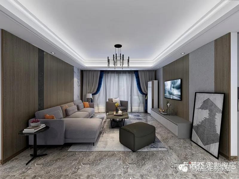 卡諾亞木光之城搭配黑金剛、漢白玉及灰姑娘組成的護(hù)墻板,在客廳里占據(jù)極其顯眼的位置,改變白墻的單一視覺?;疑蛔中碗娨暟?,與墻面遙相呼應(yīng)。