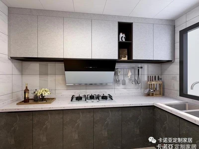廚柜色彩采用撞色設(shè)計(jì),吊柜采用淺灰的灰姑娘,地柜則是深灰的黑金剛,上淺下深,避免頭重腳輕,整體視覺簡約大氣。
