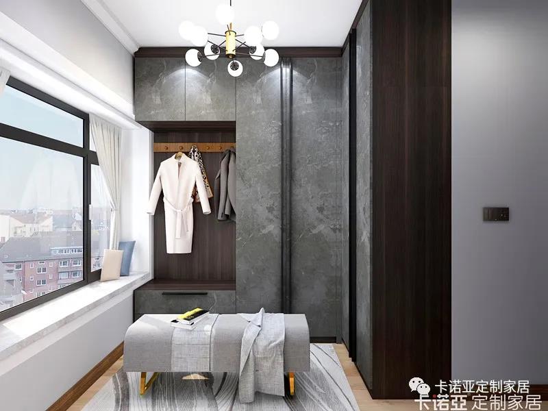 高級(jí)灰地柜+吊柜,柜體有藏有露,長條形玄關(guān)極致利用,收納性很強(qiáng)。為了方便出門整理儀容著裝,設(shè)計(jì)了一面試衣鏡,凹進(jìn)去空間設(shè)置了換鞋凳。