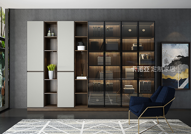 電視柜半開放設計,黑框金屬玻璃門的搭配使得整個空間更富有立體感。