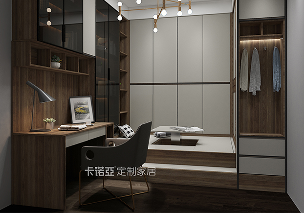 臥室比較沉穩(wěn)大氣,玻璃門半開放式衣柜黑白相間,空間空曠開放,有點極簡風。