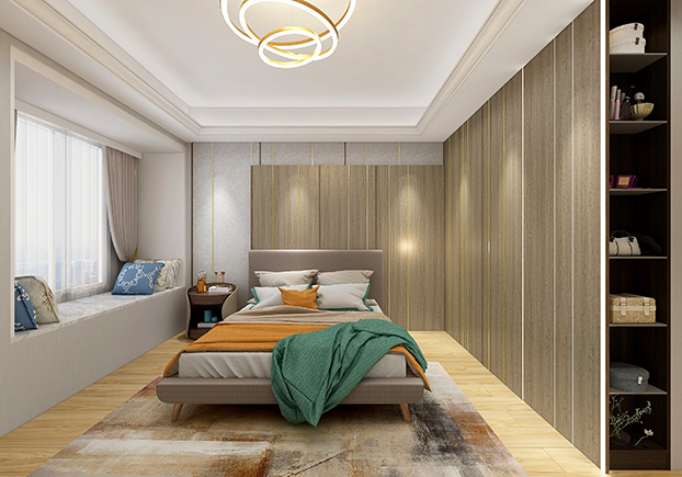 暖色調(diào)為主的臥房,走近便讓人有了睡意,窗簾配色也與墻面配色遙相呼應(yīng),一個(gè)合適的飄窗,剛好用來(lái)打發(fā)周末的閑暇時(shí)光,看本書(shū)或者倚靠著打個(gè)盹也不錯(cuò)。