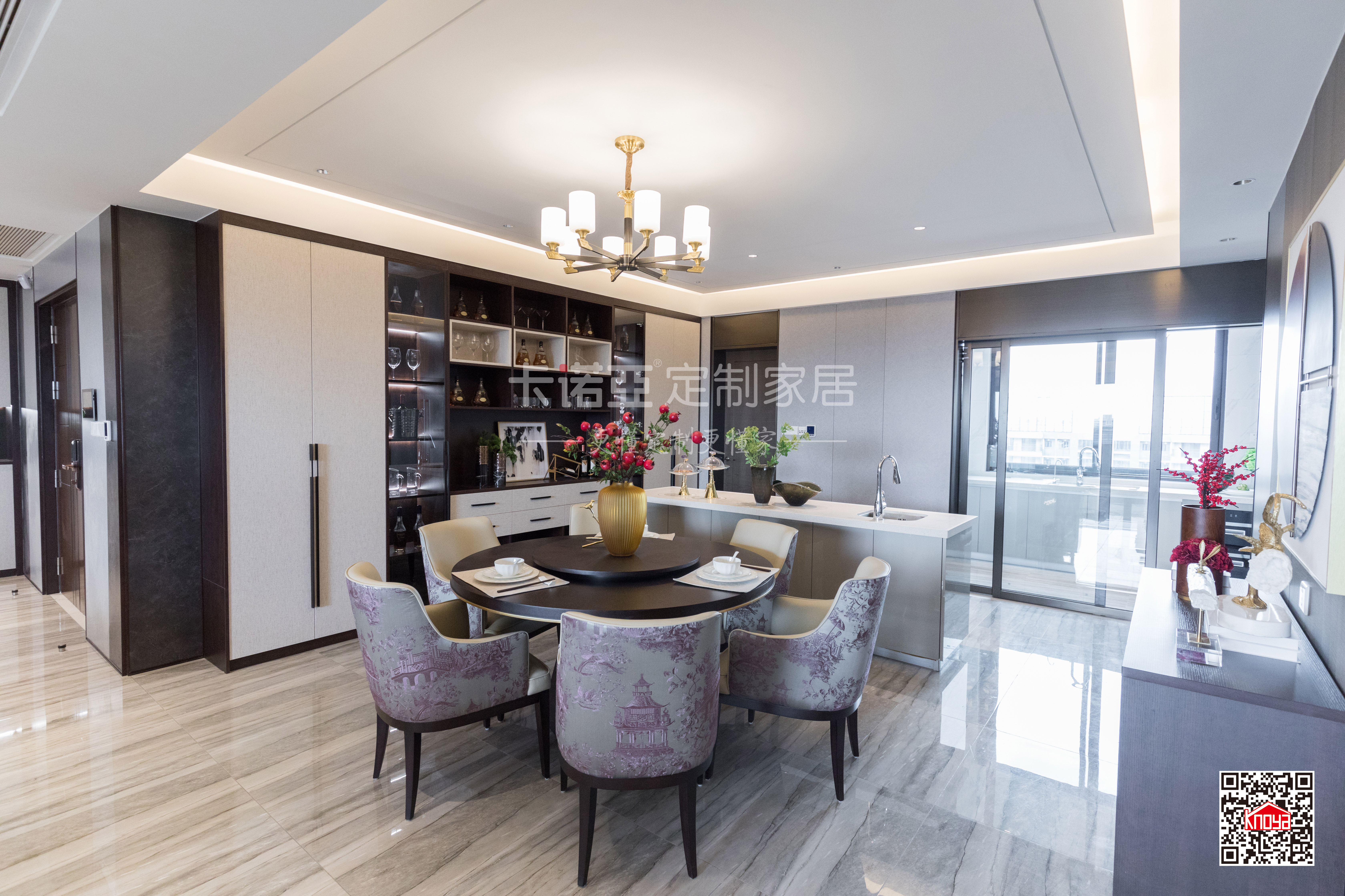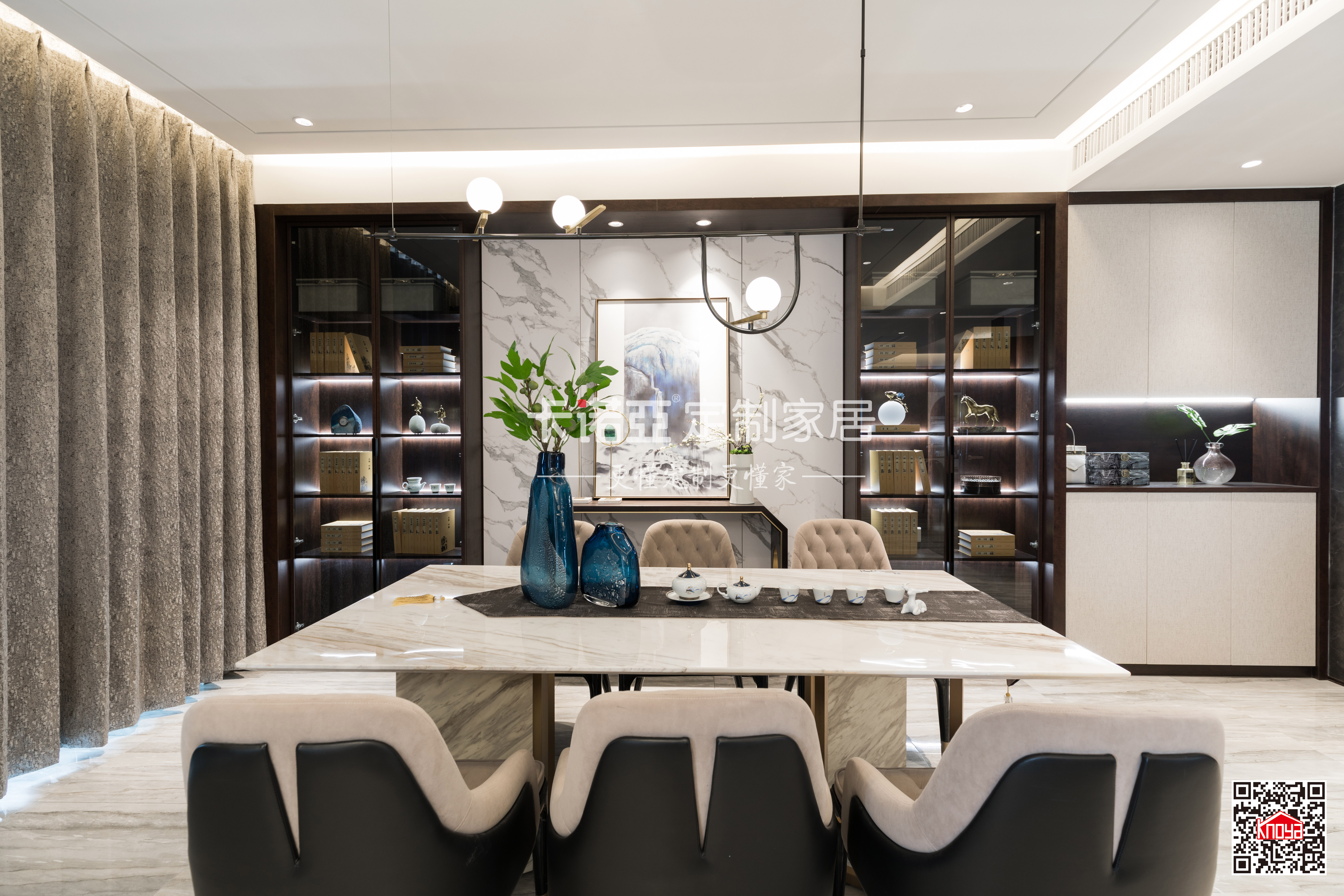 深淺柜體、黑白相間座椅,讓空間舒適而寧?kù)o,撫平金屬配飾的冷硬感。