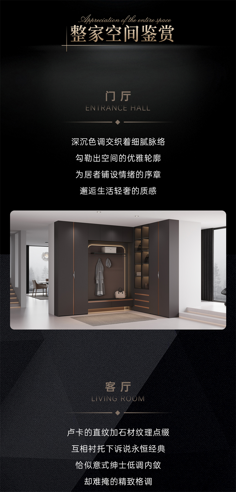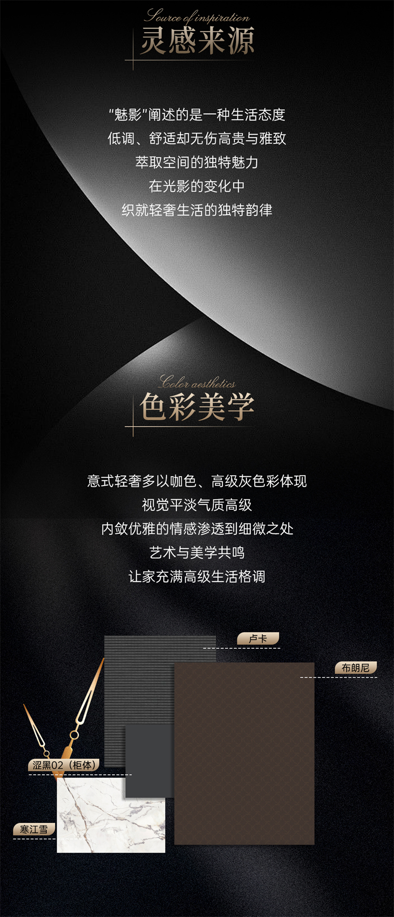 2025年新品系列,魅影系列 |意式輕奢風格魅影系列所闡述的是一種生活態(tài)度,以及一種追求品質(zhì)和精致生活的生活狀態(tài),低調(diào)、舒適卻無傷高貴與雅致,萃取意式輕奢靈韻,精準勾勒空間輪廓,刪繁就簡,織就獨特韻律。定位:中高端產(chǎn)品人群定位:25-35歲之間,鐘情意大利風尚與古典旋律的互聯(lián)網(wǎng)及金融新貴等紳士,對設計美學有獨到見解,注重高品質(zhì)生活