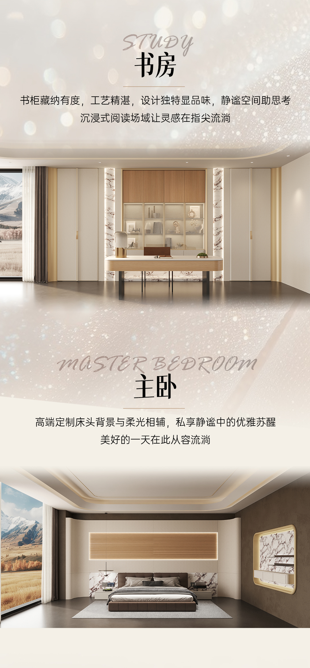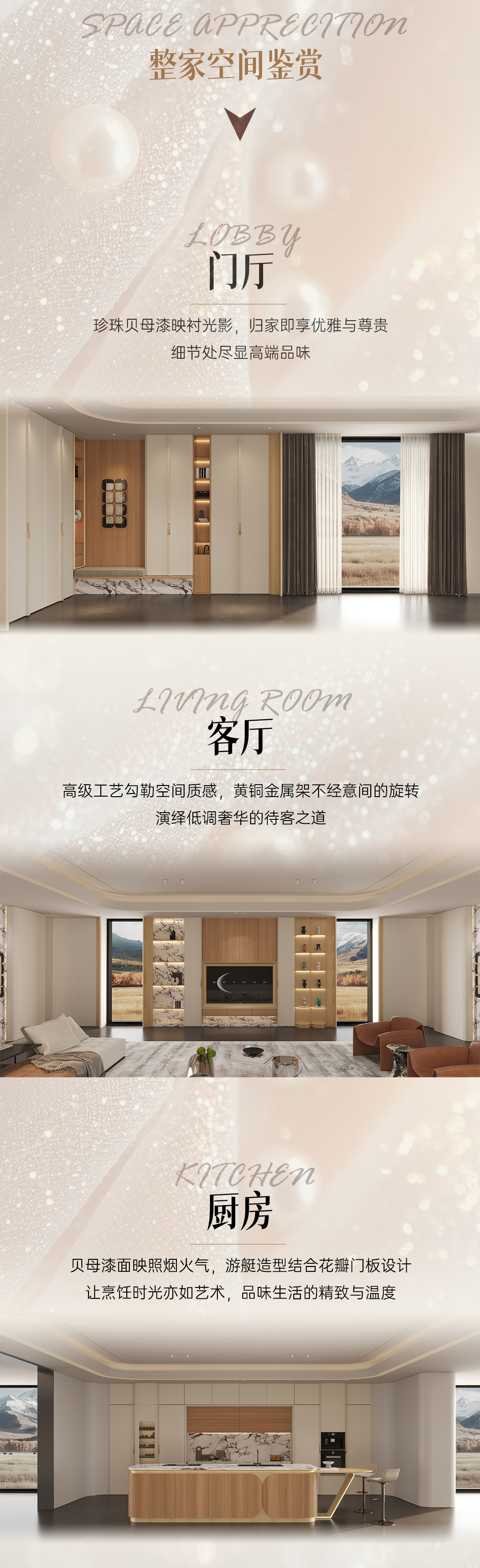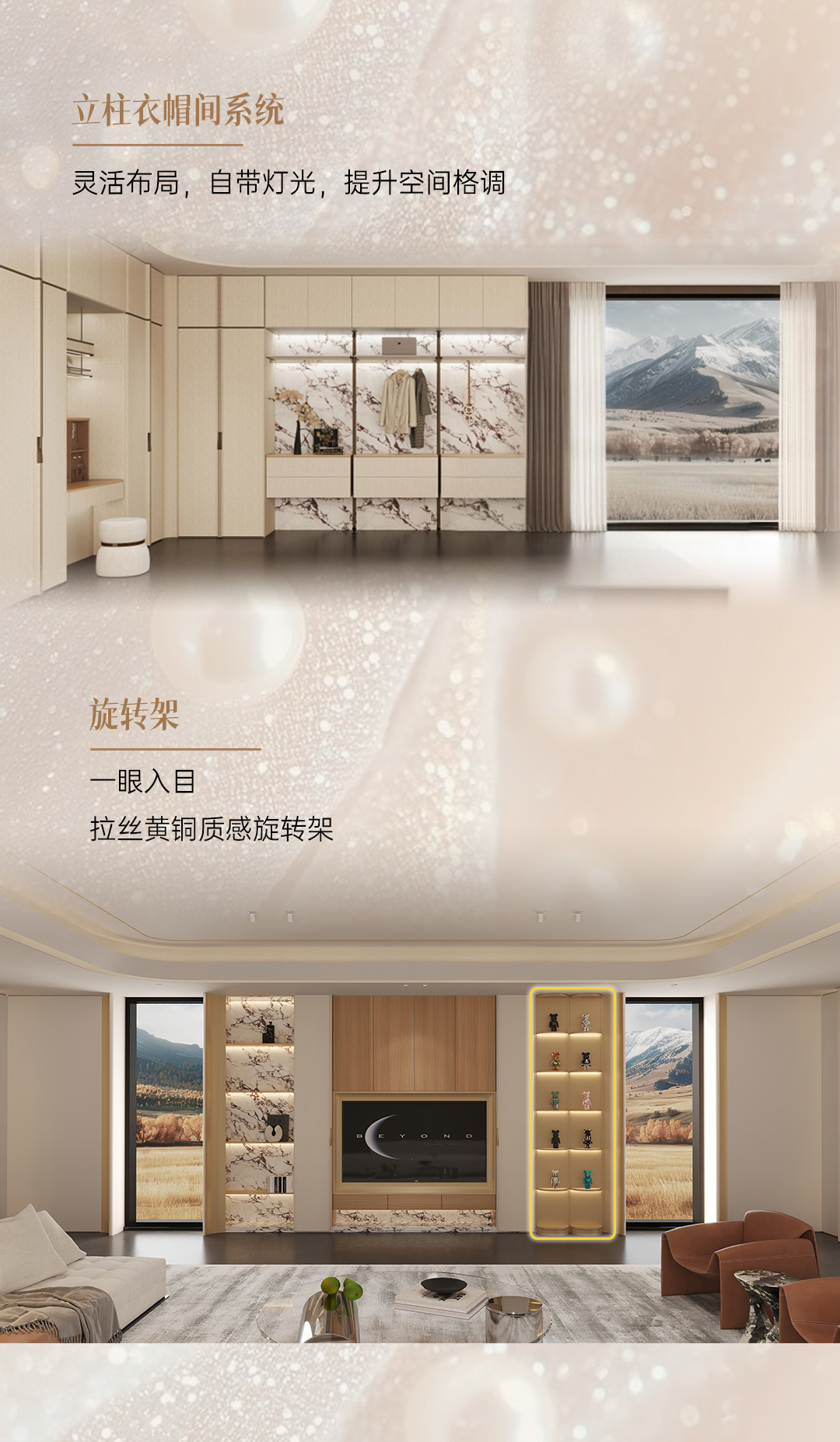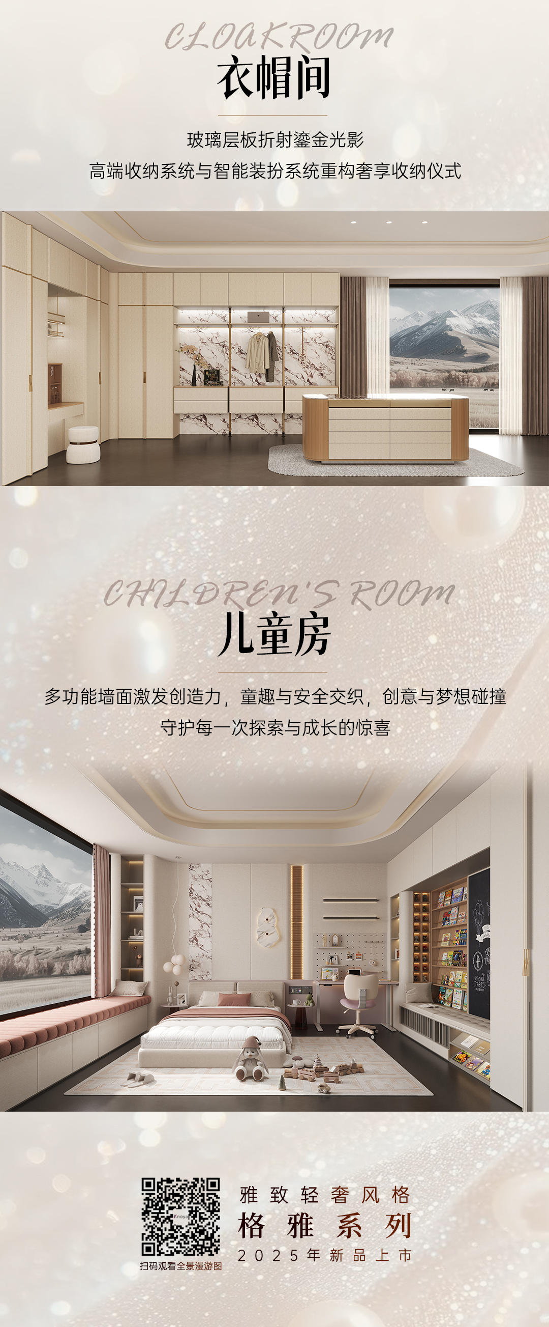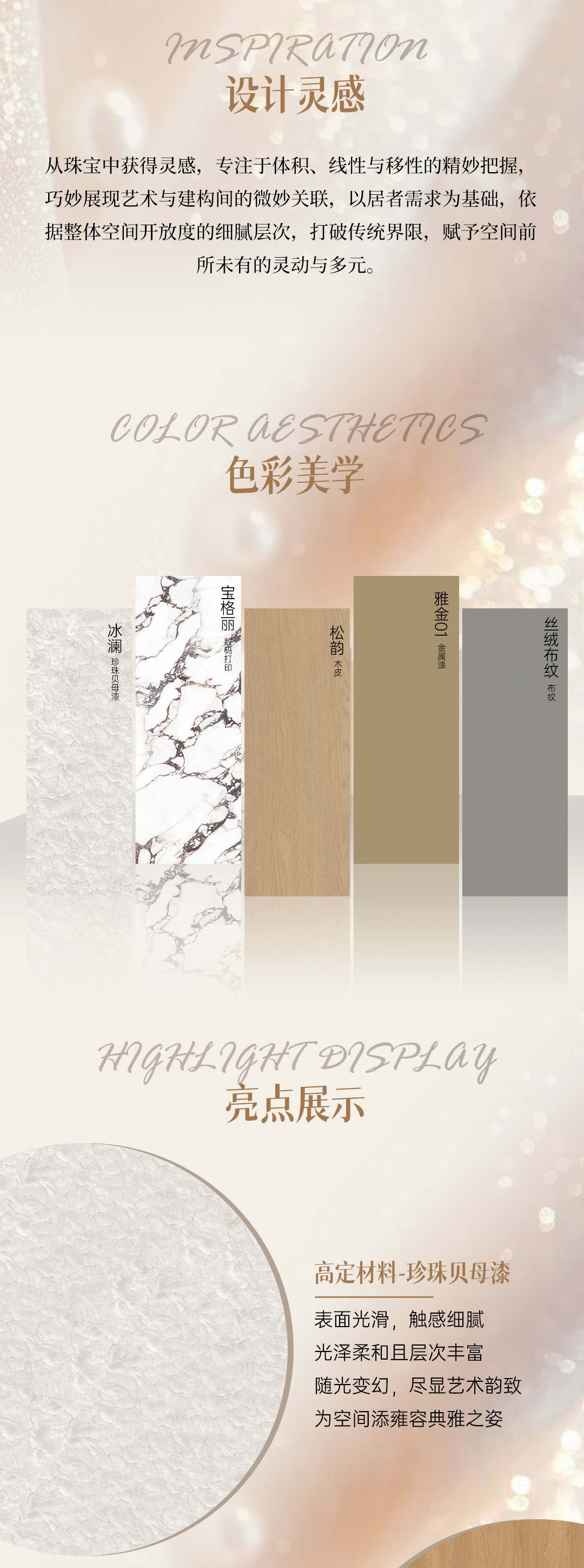 2025年新品系列,格雅系列 |雅致輕奢風格從珠寶中獲得靈感,專注于體積、線性與移性的精妙把握,巧妙展現(xiàn)藝術(shù)與建構(gòu)間的微妙關(guān)聯(lián),以居者需求為基礎(chǔ),依據(jù)整體空間開放度的細膩層次,打破傳統(tǒng)界限,賦予空間前所未有的靈動與多元。人群定位:30至45歲藝術(shù)家家庭,對生活品質(zhì)持有極致追求