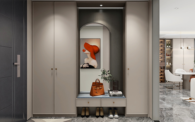 玄關(guān)柜采用“慕尼黑”與“優(yōu)雅暖灰”的撞色搭配,賦予門廳更多的色彩層次。中間凹位設(shè)計,上凹位留出展示窗,放置包包、鑰匙、帽子、綠植、飾品等,放上試衣鏡,整理儀容亦可放大空間;下凹位放常用鞋子?!澳侥岷凇备駯疟尘鞍?,成為門廳吸睛點。