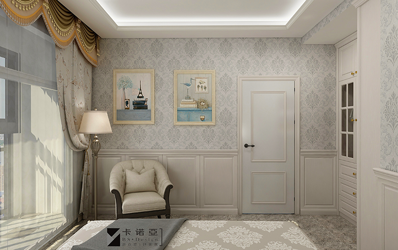 高原雪橡天然素凈的白,營造出極為潔凈素雅的家居環(huán)境,墻裙式護(hù)墻設(shè)計(jì)與歐式紋飾的壁紙、同色到頂衣柜融為一體,結(jié)合精致的吸塑造型,營造浪漫簡(jiǎn)歐風(fēng)。