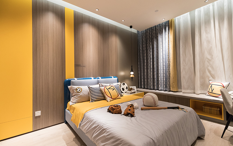 不同于普通的兒童房墻面采用油漆,本套空間的墻面加入了護(hù)墻板,除了營(yíng)造簡(jiǎn)潔明快的專(zhuān)屬兒童臥室特征之外,采用原木色與活力橙條紋相間的護(hù)墻板,清新健康,為整個(gè)空間增添了活力。