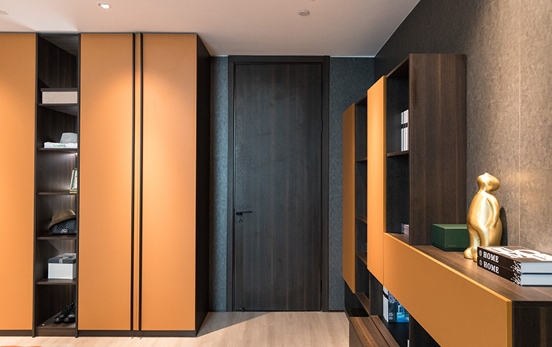 臥室門的顏色選擇,注重與整體家具相搭配,同時與室內的墻面顏色形成一定的反差,讓臥室顯得更加有層次。為了改變深色調的沉悶感,地面采用淺色木紋的木地板,衣柜等臥室家具的門板采用橙黃色,點亮了空間的活力,營造沉穩(wěn)中帶有溫馨的氣氛。
