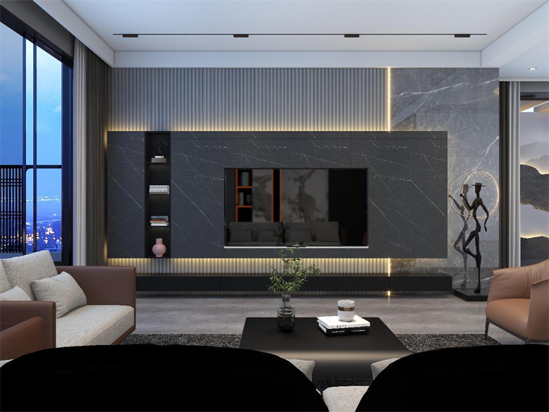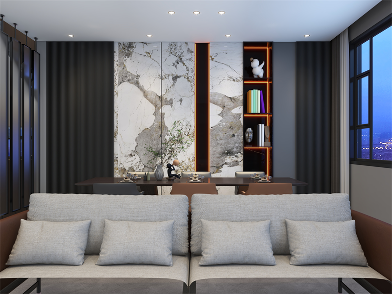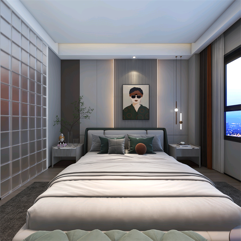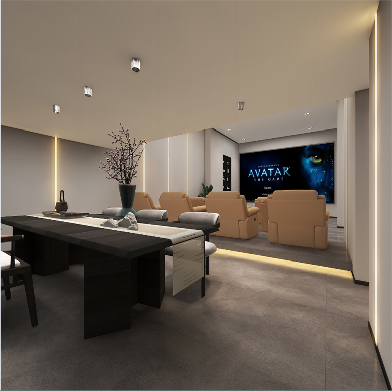 此案,為現代極簡風格,整體以簡單大氣,穩(wěn)重不失溫馨,設計上嚴格遵循人體工程學原則,在造型、材質等方面要符合人的生理和心理需求。此案設計的色彩比較單一,顏色多選用單色,或少數幾種顏色搭配。避免使用多種顏色混搭以及避免使用強烈對比的顏色,復雜華麗的顏色,反對繁瑣的花紋色彩的搭配。在色彩上追求平和、舒緩、內斂之感極簡主義的設計多采用直線、方形,或規(guī)則簡單的幾何形狀,減去一切不必要的元素與細節(jié),比例精確,整體呈現簡潔明快,干凈利落感覺。此案中大部分空間運用了無主燈,因為無主燈設計講究的是“見光不見燈,分區(qū)域散點照明”。而且的無主燈設計能夠讓空間更具層次感,顯得非常的高級,若隱若現,層次分明。