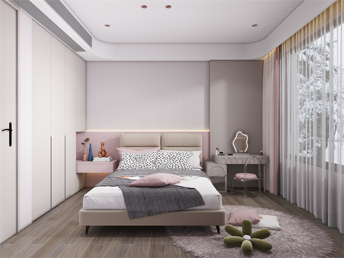 家具選擇上,以簡約現(xiàn)代風(fēng)格的家具為主,注重舒適度和功能性。軟裝細節(jié)上,采用柔和的色彩和材質(zhì)。廚房注重實用性和便利性,采用嵌入式收納設(shè)計,最大化利用空間,營造一個干凈整潔的烹飪區(qū)域。臥室以舒適為設(shè)計重點,采用柔和的色調(diào)和舒適的床品,營造令人放松的休息空間。充分利用儲物空間保持整潔有序。
