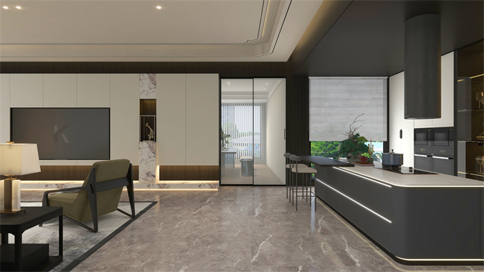 餐廳:餐廚一體化設(shè)計(jì),縮短用餐動(dòng)線,增加交互性,更符合當(dāng)代人的需求。島臺(tái)、吧臺(tái)與餐桌融為一體省空間,圓弧轉(zhuǎn)角營(yíng)造東方人居的溫潤(rùn)感,鋪陳優(yōu)雅、低調(diào)、現(xiàn)代、隨性的餐廳氛圍。