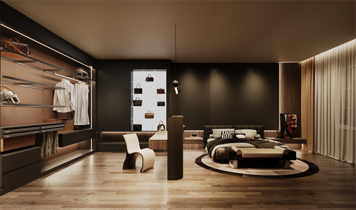 紳·逸系列設(shè)計(jì)靈感上,源于繁華都市的夜晚,低沉的色調(diào)彰顯當(dāng)代企業(yè)家“閑在臥室”的生活狀態(tài),靜謐中暗藏內(nèi)斂奢華。設(shè)計(jì)手法上,整個(gè)系列展示兩個(gè)空間(客廳、臥室),以高級(jí)灰搭配深色木紋為主基調(diào),配合流行的弧形及斜邊工藝。低調(diào)素雅的整體視覺,充分詮釋意式輕奢的美學(xué)。臥室空間結(jié)合睡眠、衣帽間及輕健身功能,符合成功人士對(duì)高品質(zhì)生活和健康人生的追求。