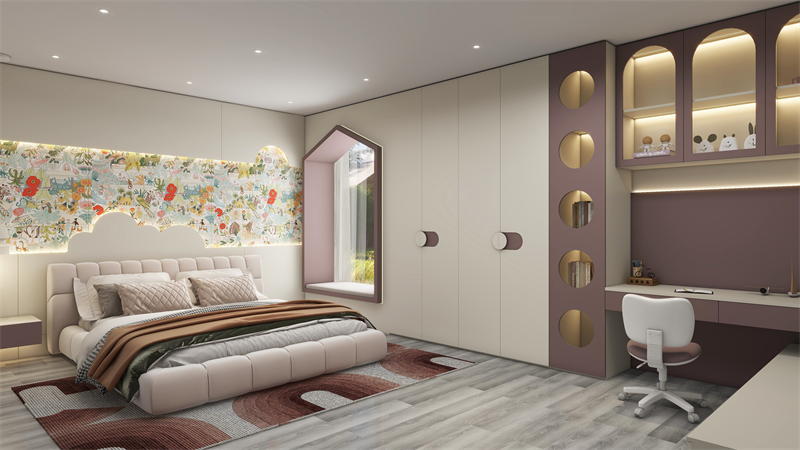 軟裝配飾:添加適量的軟裝配飾,如毛絨玩具、絲綢抱枕,增加臥室的柔軟度和溫馨感。同時(shí),注意材質(zhì)間的對(duì)比與統(tǒng)一,保持整體風(fēng)格的和諧。