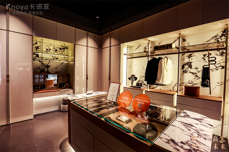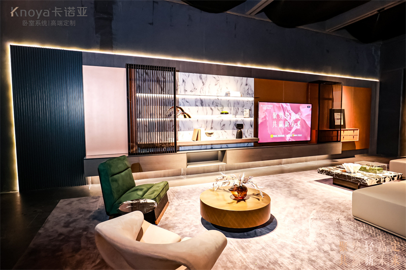 其次,設(shè)計(jì)上,依靠原創(chuàng)設(shè)計(jì)構(gòu)筑美學(xué)家居。卡諾亞推出的輕高定系列新品,均屬于原創(chuàng)設(shè)計(jì),以本次參加輕高定展的現(xiàn)代中式藏玉系列為例,采用天然胡桃木皮與數(shù)碼打印石紋碰撞,原創(chuàng)品牌 LOGO 拉手與倒 R 角工藝相映成趣等,為企業(yè)高管精英構(gòu)建禮序雅境;另一參展作品雅致輕奢風(fēng)格格雅系列,從高級珠寶中淬煉靈感,運(yùn)用珍珠貝母漆的流光、拉絲黃銅的肌理等元素,結(jié)合豪華游艇的舷窗式結(jié)構(gòu)打破傳統(tǒng)空間的方正,發(fā)光層板與榆木木皮形成冷暖對話等,將藝術(shù)基因注入實(shí)用主義,打造功能多元化的美學(xué)家居空間。