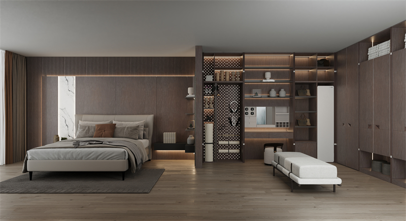 產(chǎn)品亮點(diǎn):1.松韻、耀金、秋香木等溫潤(rùn)色調(diào)巧妙組合,構(gòu)筑“雅而不寡” 的視覺(jué)基調(diào),營(yíng)造溫馨高雅的空間氛圍。2.采用進(jìn)口榆木木皮,呈現(xiàn)自然美觀的質(zhì)感,且具備環(huán)保健康、耐用性強(qiáng)、個(gè)性造型等優(yōu)點(diǎn).3.金屬水性漆環(huán)保健康, 3底2面的涂裝工藝,裝飾空間質(zhì)感更高級(jí)。4.獨(dú)特斜向切割面與門型設(shè)計(jì),搭配 25mm超導(dǎo)發(fā)光層板、宣紙發(fā)光板及ABA夾心工藝等,演繹“Less is more”的輕高定美學(xué),展現(xiàn)精致簡(jiǎn)約的空間格調(diào)。