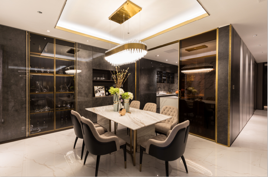 廚房和餐廳一體化設(shè)計(jì),高亮光門(mén)板一板到頂,空間更顯大氣,黃銅金屬線條的點(diǎn)綴,讓就餐多了一份奢麗。餐廳緊挨著廚房,拿取美食也較為方便。歐式靠背的椅子更有著獨(dú)特的人文韻味,輕奢格調(diào)的設(shè)計(jì),不僅讓就餐多了一份藝術(shù)感和儀式感,還會(huì)讓人心情大好,胃口也會(huì)大開(kāi)。
