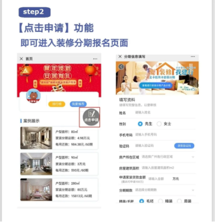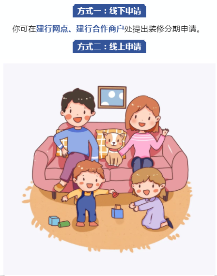 你在線(xiàn)上、線(xiàn)下亦可申請(qǐng)報(bào)名裝修分期,并向建行工作人員提交身份證、房產(chǎn)證明等相關(guān)資料。