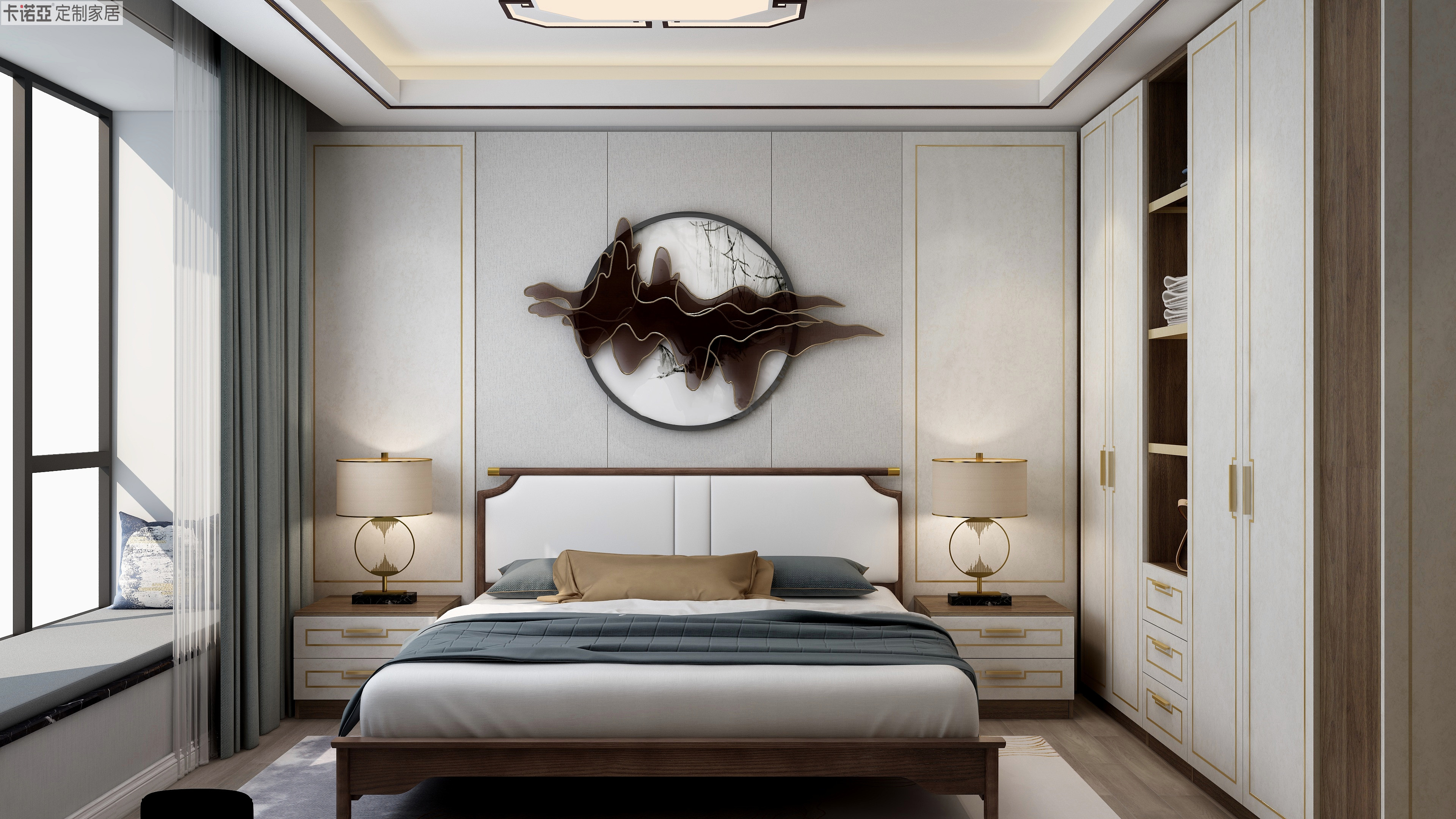 米色成為空間的主色調(diào),輔以木紋材質(zhì),自然而舒適,營(yíng)造良好的睡眠環(huán)境?;丶y型金屬條及黃銅色拉手點(diǎn)綴空間,盡顯新中式風(fēng)格的輕奢觀感。