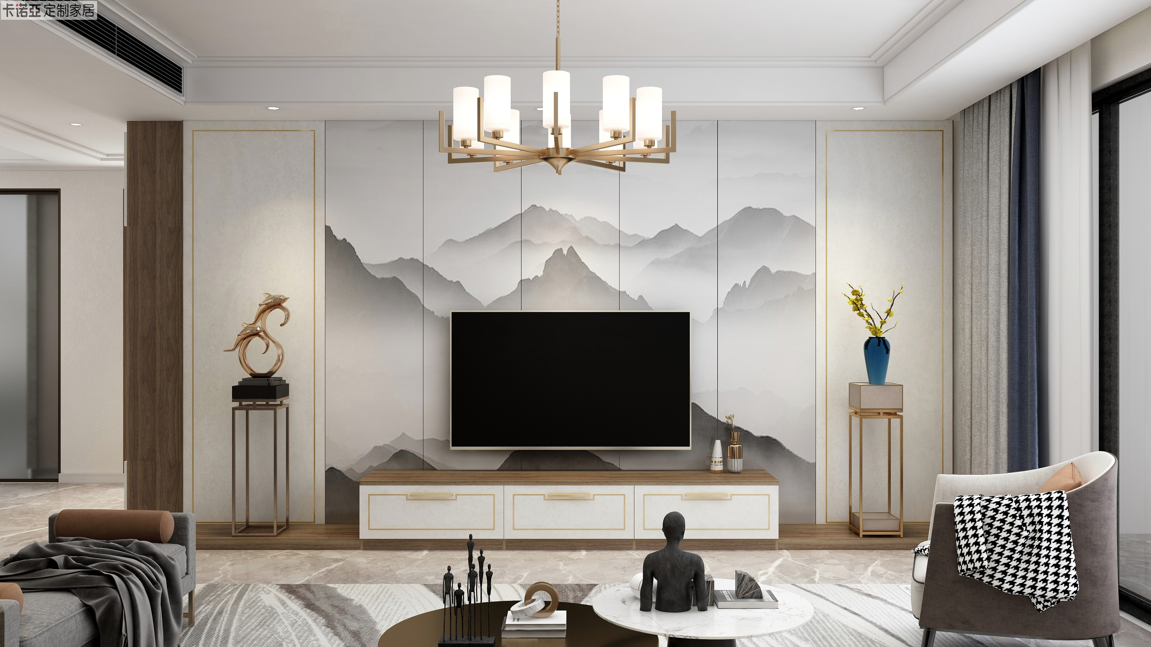 3D中式山水畫作為電視背景墻,讓人耳目一新。搭配側(cè)邊對(duì)稱的護(hù)墻板,采用回紋型金屬條的金邊勾勒,于無聲處驚鴻一瞥,營(yíng)造意境悠遠(yuǎn)的東方禪意空間。