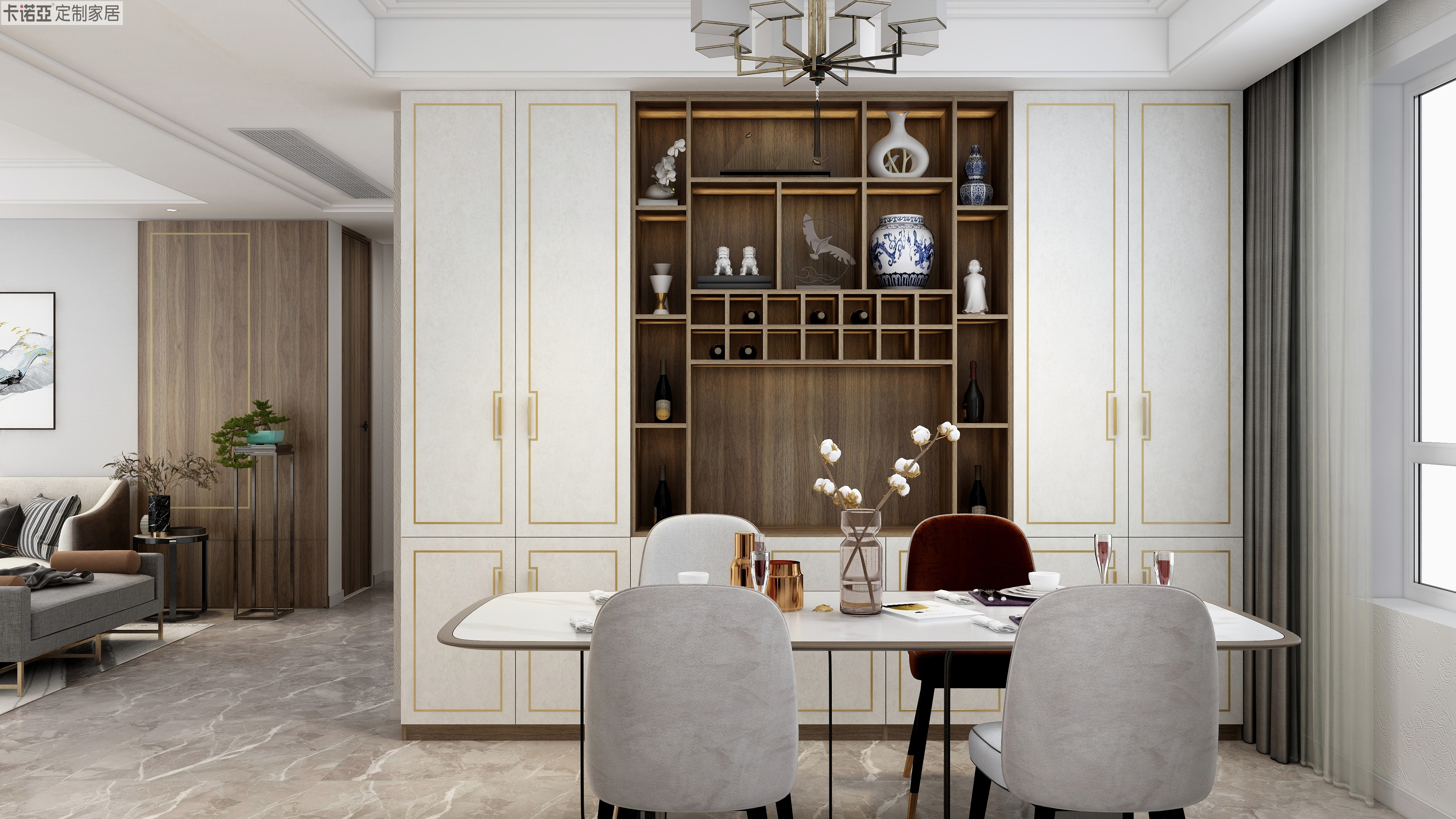 餐廳延續(xù)客廳風(fēng)格,餐邊柜采用左右對(duì)稱均衡的回紋型金屬條,在擴(kuò)大收納的同時(shí),顏值也大為提升。開放與封閉結(jié)合,讓空間多了一份呼吸感,中式宮燈映射下,讓就餐洋溢滿滿的儀式感。