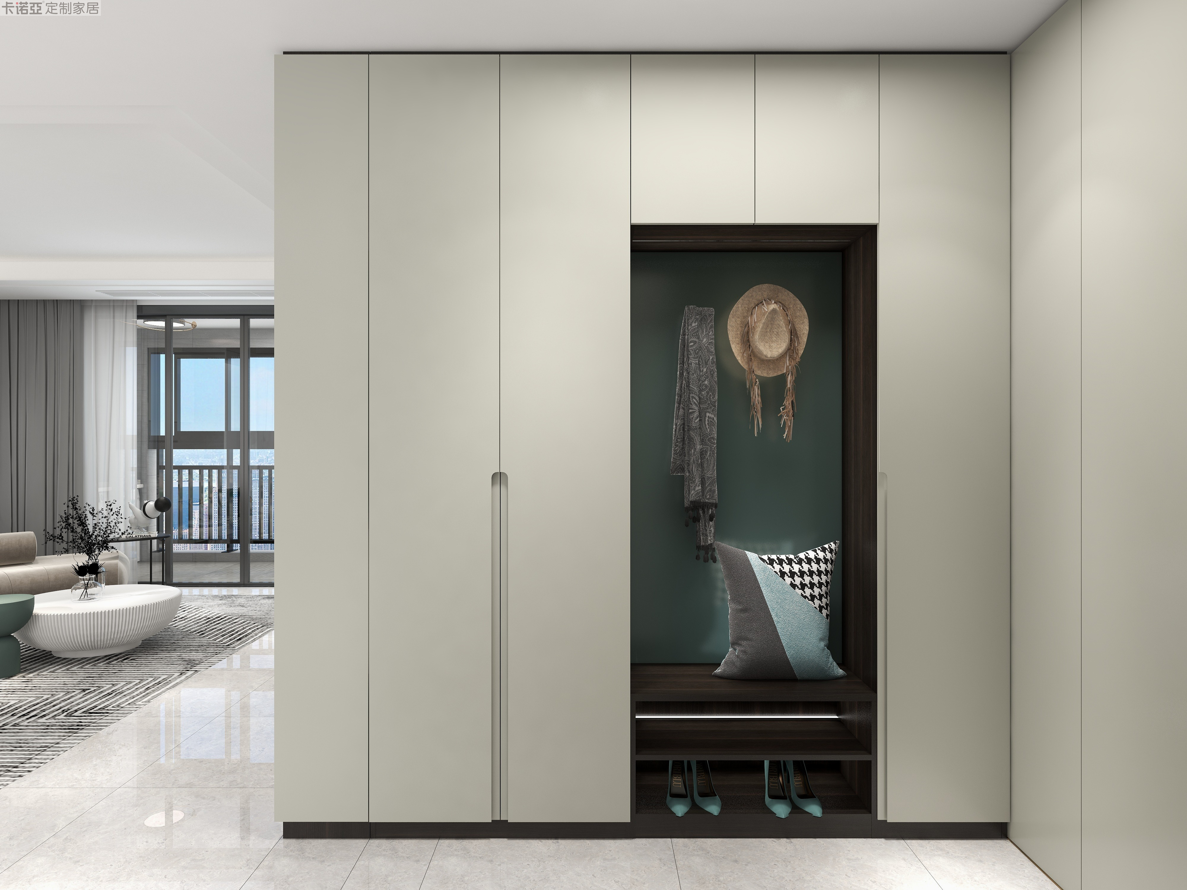 極簡的玄關(guān)門廳,一柜到頂,擁有強(qiáng)大的儲物功能。中間鏤空,采用深色的“鈴蘭綠+黑澤明”,撞色淺色的“水云紗”,高尚配色彰顯無遺。隱藏式拉手,讓門廳柜視覺流暢,整體性更強(qiáng)。墻面掛鉤、感應(yīng)式燈帶、換鞋凳、雙層格子等巧心思設(shè)計(jì),讓門廳柜好看又好用。
