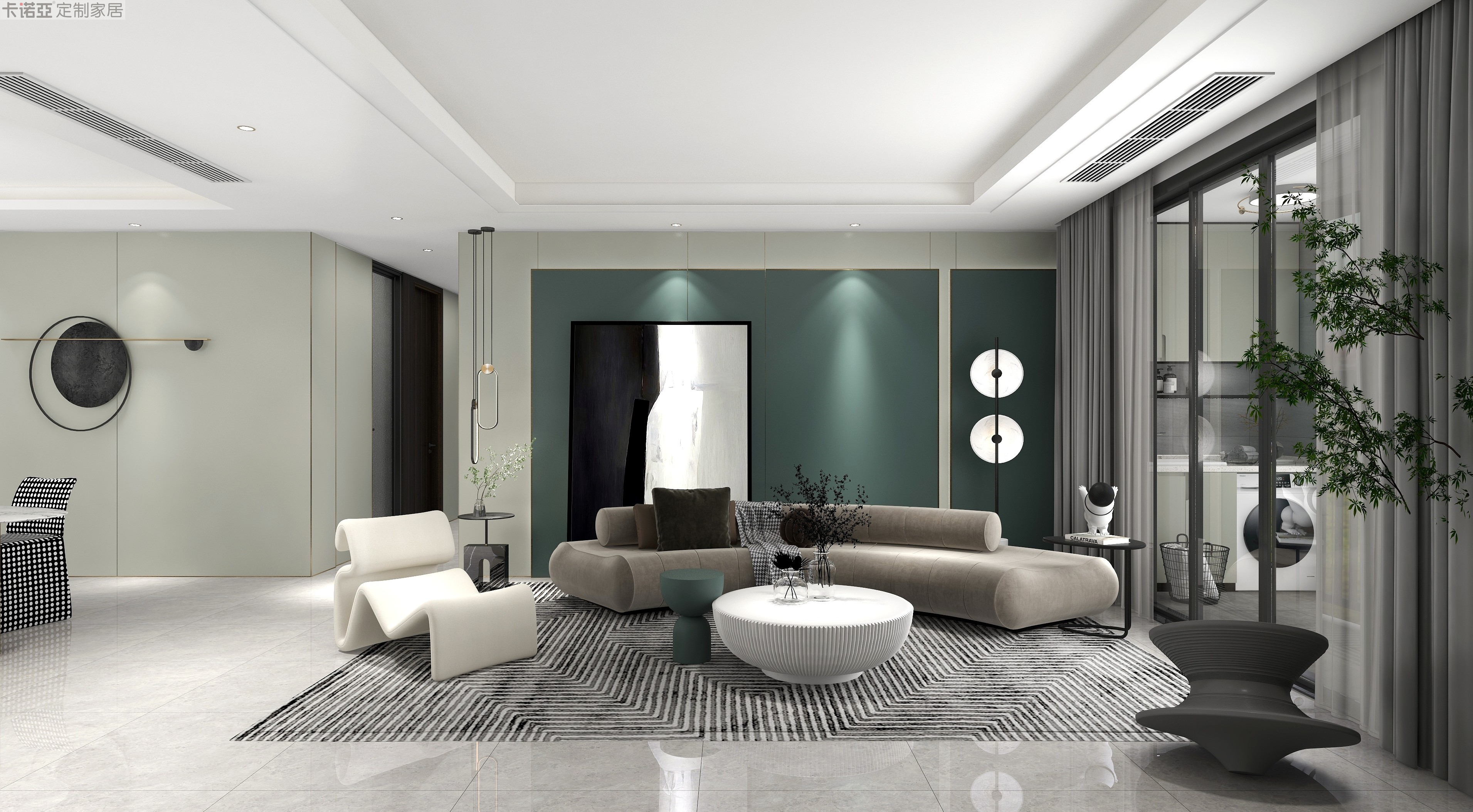 沙發(fā)背景墻同樣不可忽略,大面積采用“鈴蘭綠”,掛上一幅蒙德里安的抽象幾何圖形大型掛畫,一改灰白色系的冷感,為客廳帶來藝術(shù)、生機(jī)與活力。