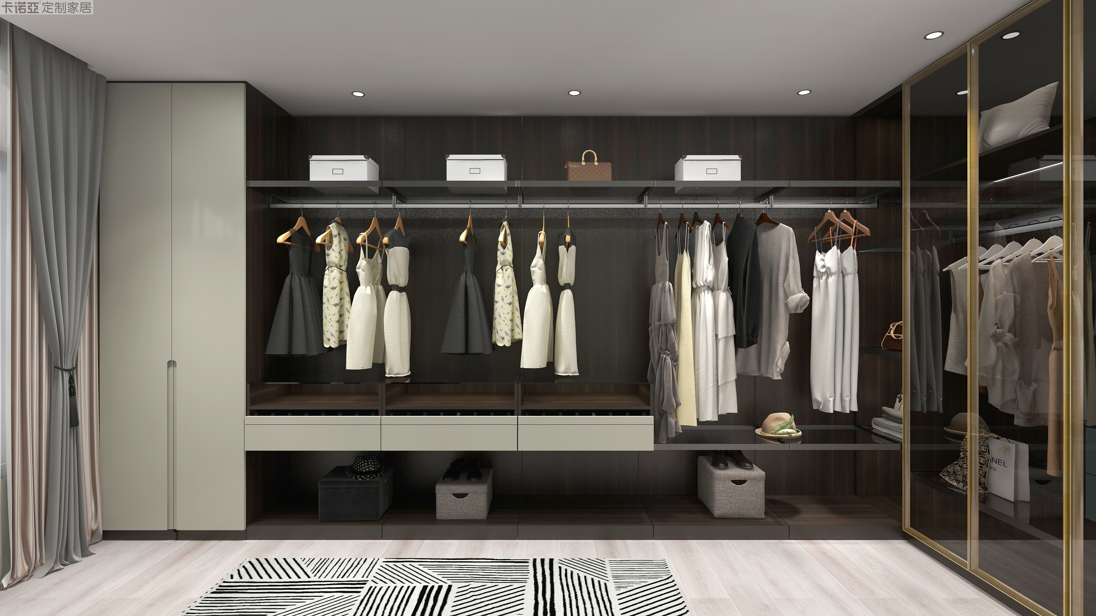 半開放式衣帽間,呈L型,做到轉(zhuǎn)角不浪費(fèi)。針對年輕人高節(jié)奏的生活需求,增加開放式掛衣區(qū),尋找衣物更便捷,換裝更高效。鋁框玻璃門提高空間通透性,擴(kuò)容效果明顯,體量大的衣帽間也可以變得輕盈時(shí)尚。