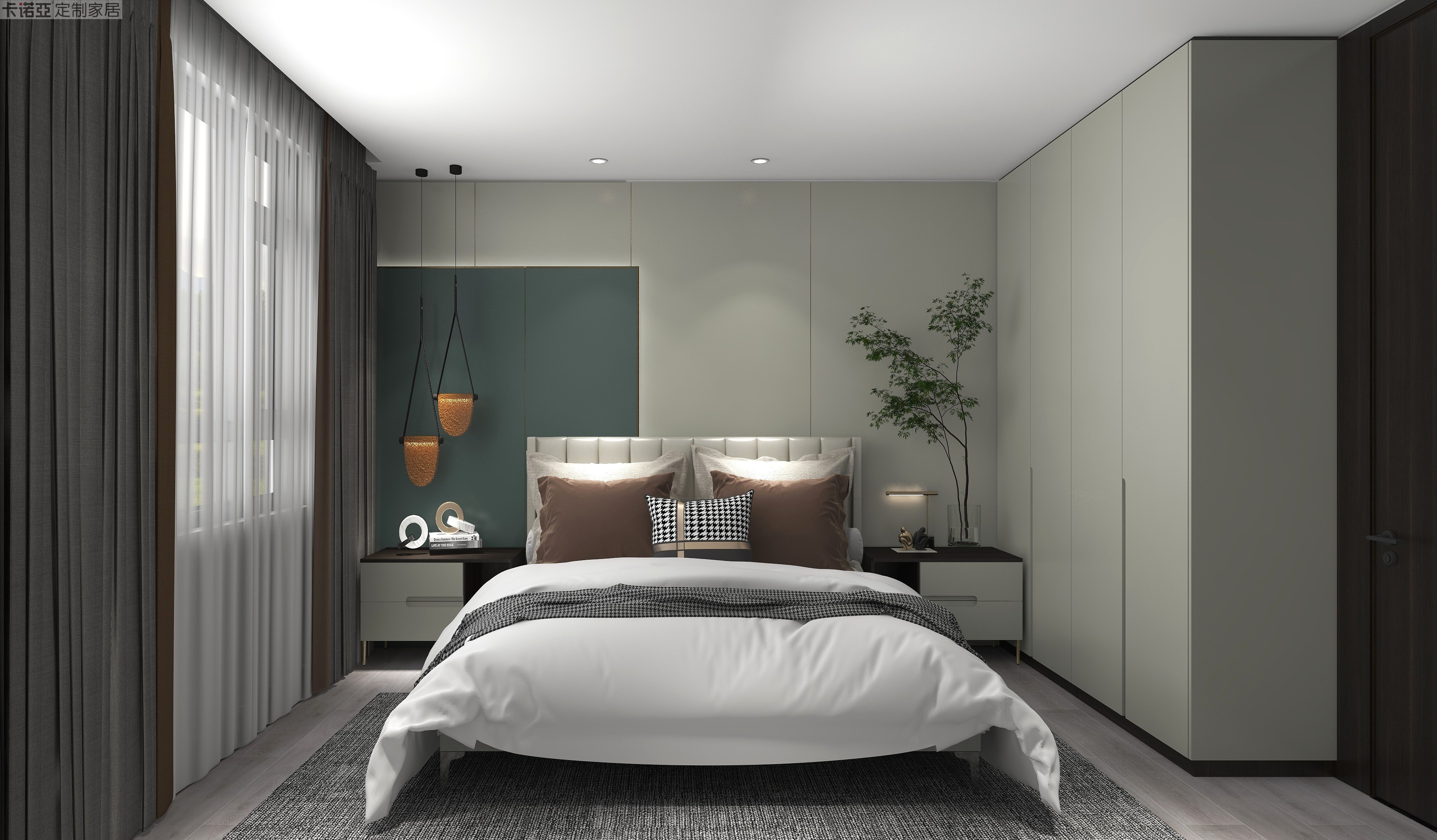 延續(xù)主臥調(diào)性,床頭背景墻采用“水云紗+鈴蘭綠”的混搭,靜謐中增添一絲活力;高低不一的金色吊燈,讓床頭成為焦點(diǎn),營造輕奢感。衣柜柜門與護(hù)墻板同色,過渡更自然。隱藏式拉手,呈現(xiàn)在衣柜和床頭柜設(shè)計(jì)上,避免磕碰的同時(shí),整體視覺更統(tǒng)一。