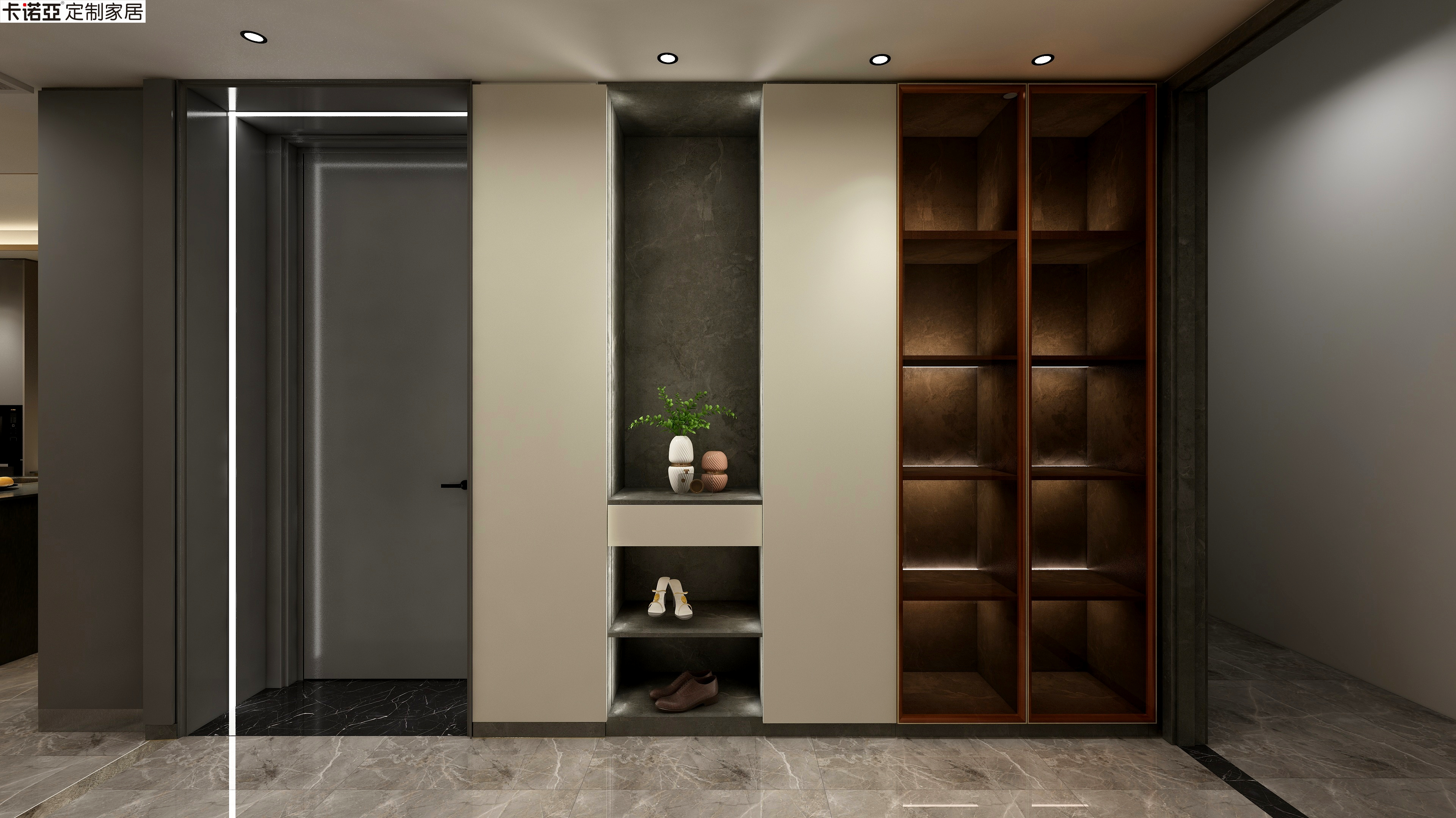 柜體及柜門采用“黑金剛×雅杏”經(jīng)典黑白配,茶色玻璃、銅色邊框點(diǎn)綴,空間簡(jiǎn)約通透中顯輕奢。中間鏤空設(shè)計(jì),擺放常用鞋子,或放置飾品,墻板設(shè)置掛衣鉤,可掛上衣帽、包包、雨傘、絲巾等,解放雙手,輕松回家。到頂鞋柜柜門采用莫蘭迪色系“雅杏”,表面覆上一層水性漆 ,手感溫柔恰似一層薄紗,減緩原有“黑金剛”柜體的厚重,高端既視感呼之欲出。