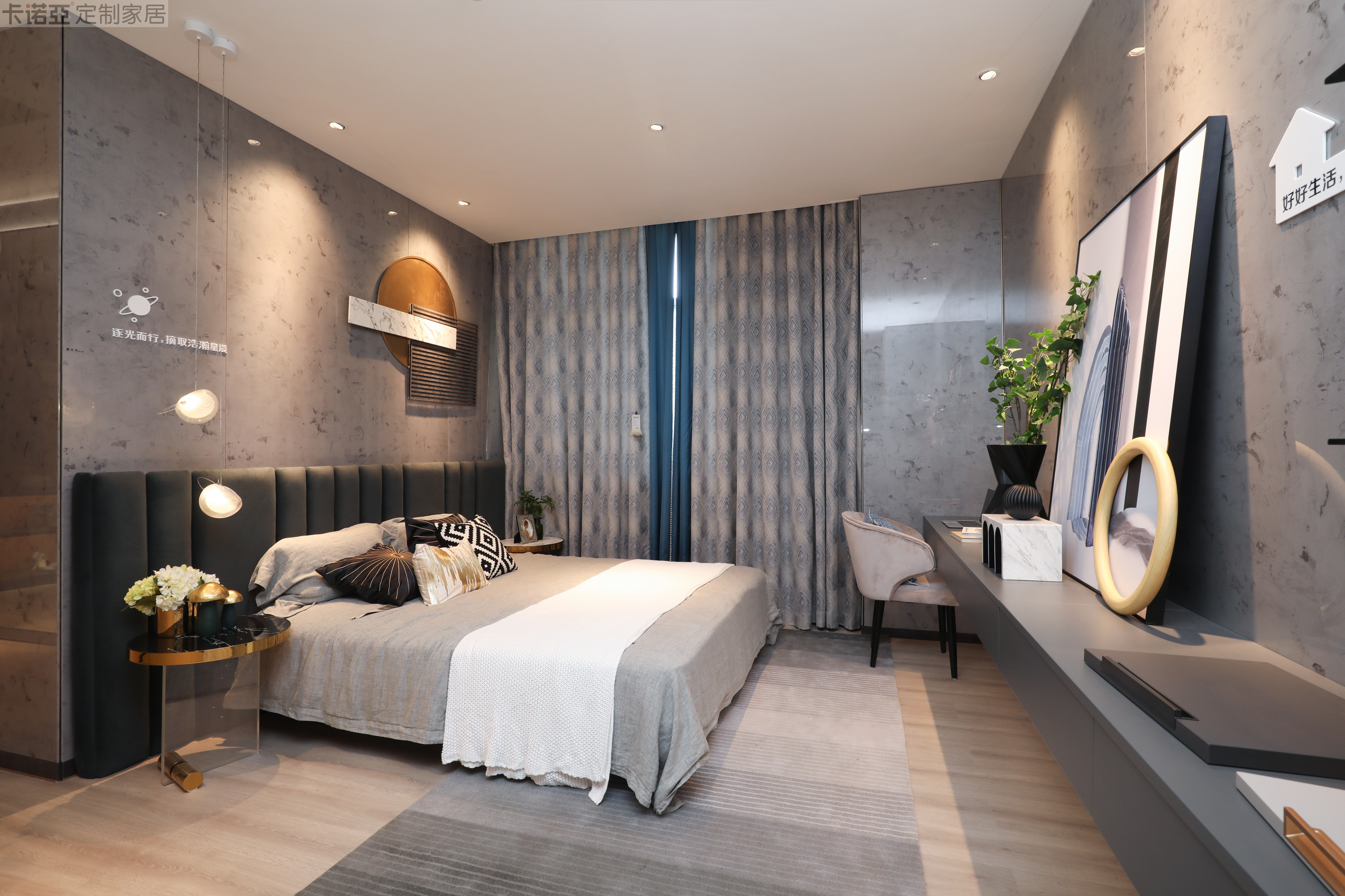 靜謐灰色系,營(yíng)造安靜的睡眠環(huán)境。“霧光灰”護(hù)墻板百變紋理,點(diǎn)綴3D掛畫,為灰色空間注入活力。長(zhǎng)條形懸空柜可化妝可學(xué)習(xí)可收納,將空間裝飾的修長(zhǎng)而雋永。
