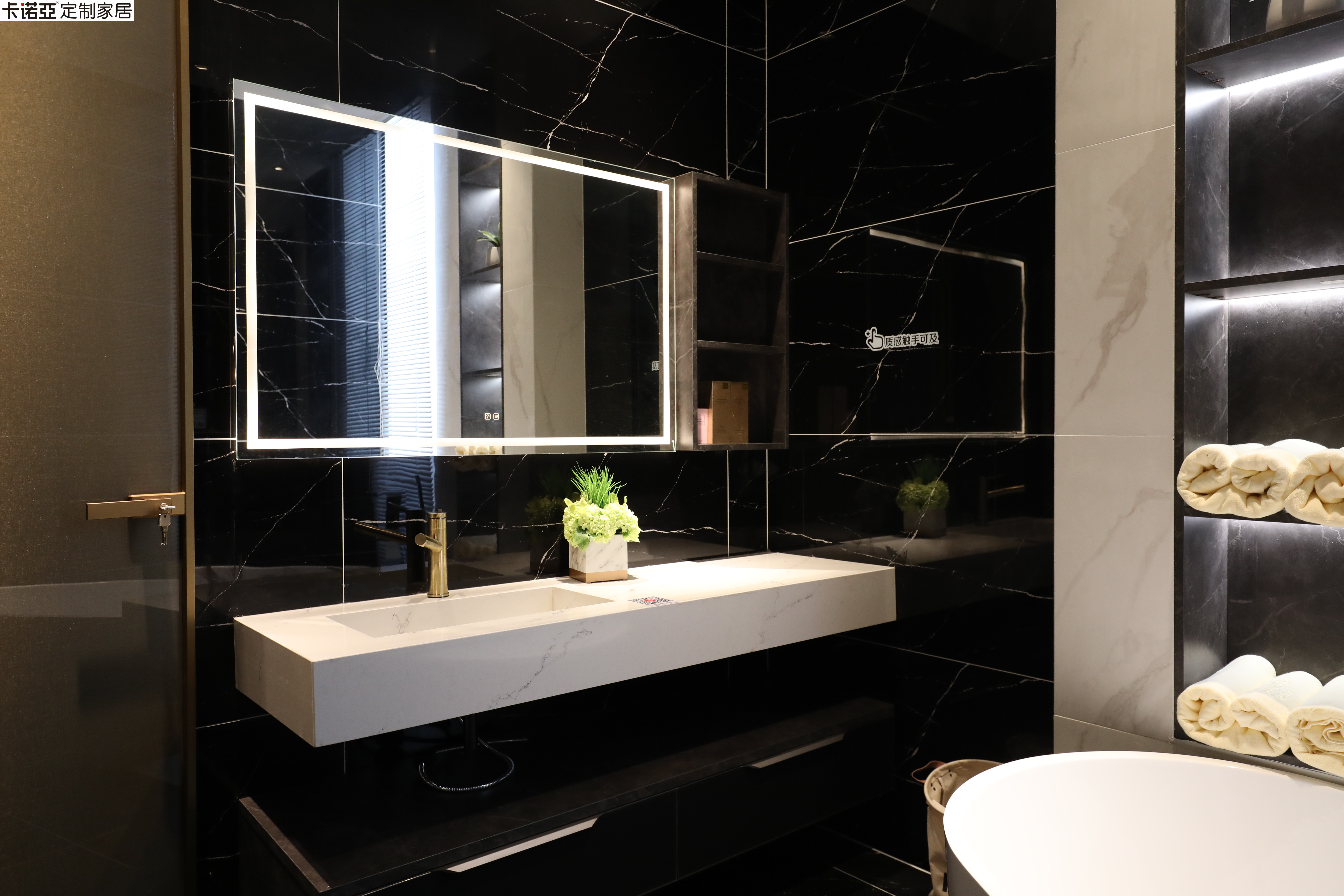 黑白灰簡(jiǎn)約經(jīng)典配,遠(yuǎn)離花哨,不強(qiáng)烈、不刺激,視覺上做到減壓,讓浴室酷感兼具低調(diào),利于在忙碌后享受安靜沐浴的放松。懸空洗手臺(tái),輕盈靈動(dòng)不占空間,亦可防潮。鏡面柜門,合上是化妝鏡,打開可收納。