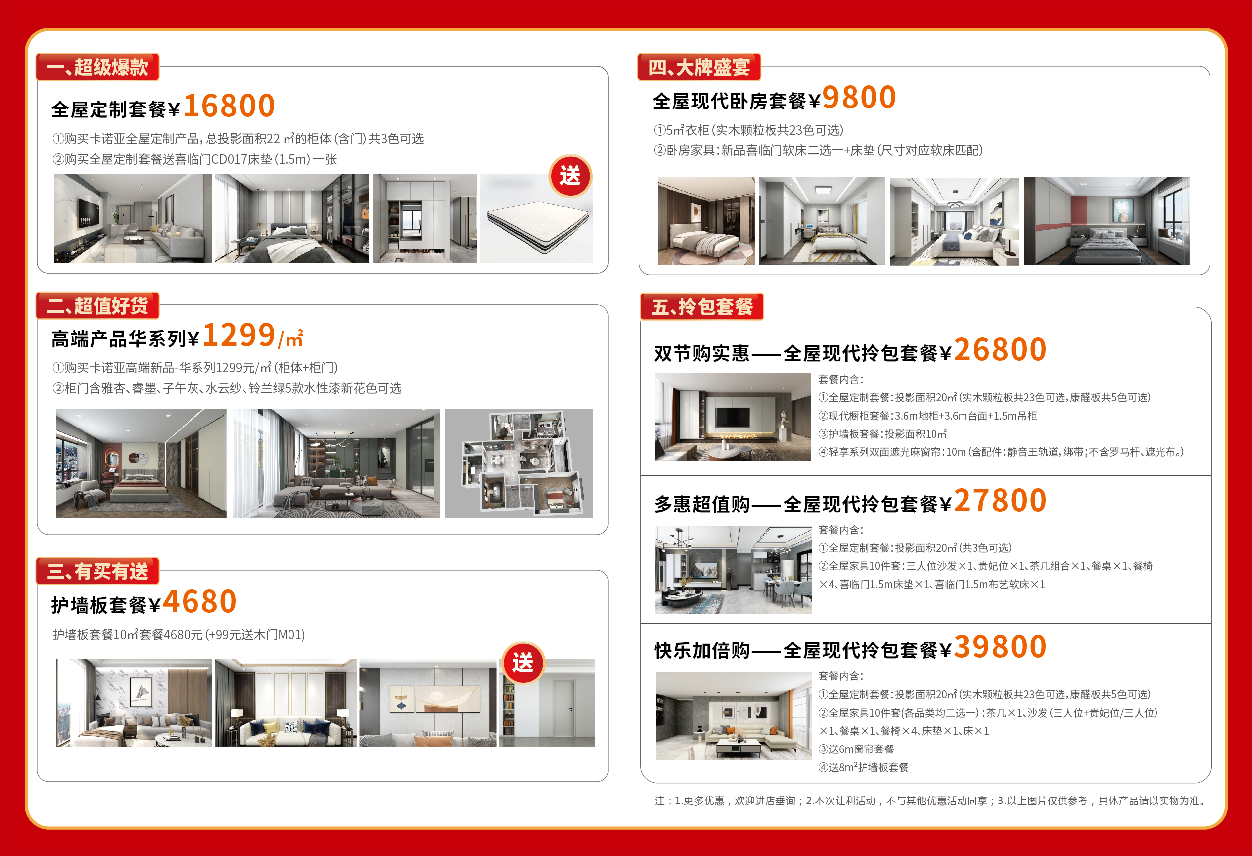 此次鉅惠,主要包括經(jīng)典全屋定制套餐¥16800,高端產(chǎn)品華系列¥1299/㎡,護墻板套餐¥4680,全屋現(xiàn)代臥房套餐¥9800,全屋現(xiàn)代拎包套餐¥26800、¥27800、¥39800,將優(yōu)惠進行到底。