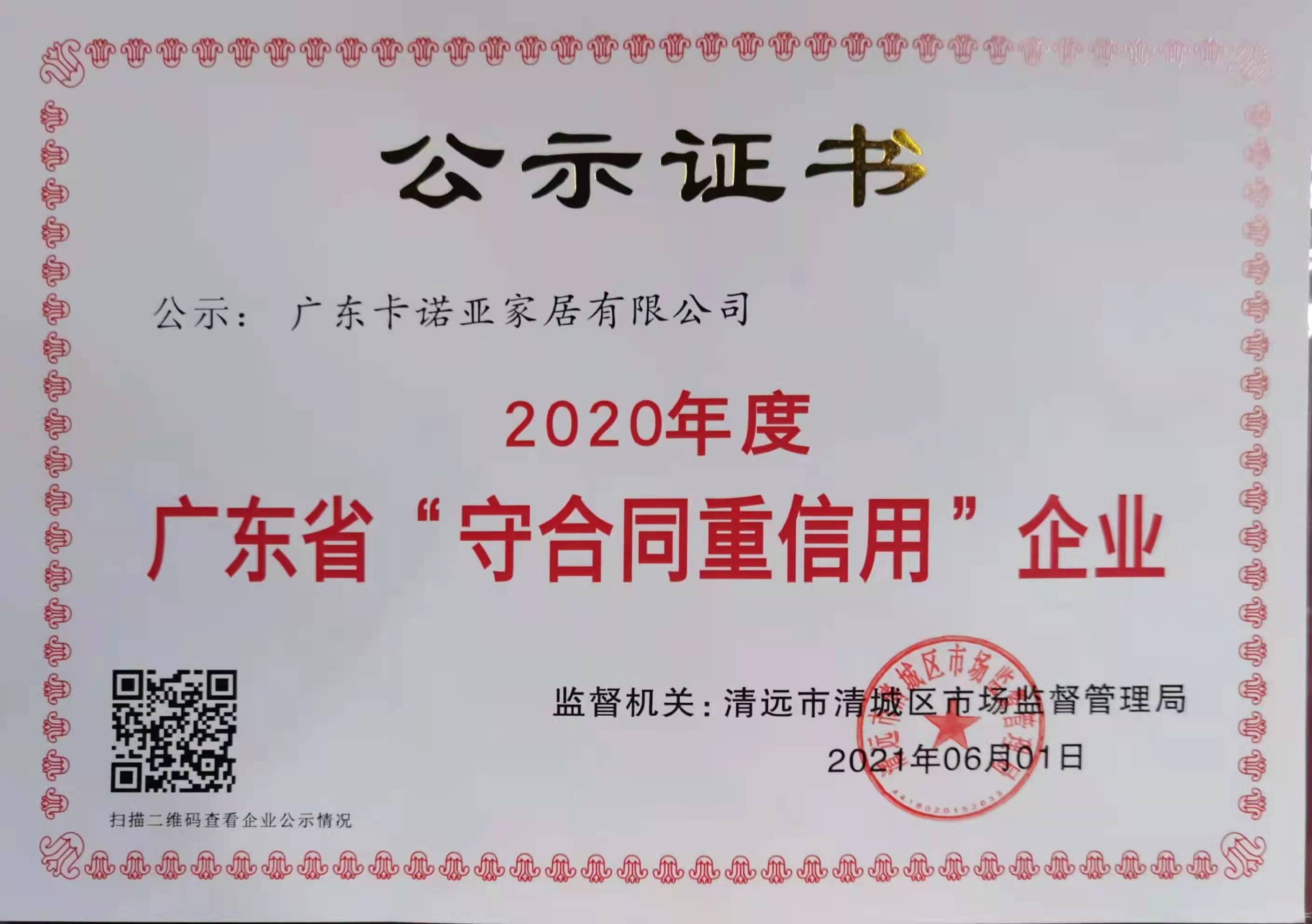 近日,廣東省清遠市清城區(qū)市場監(jiān)督管理局對廣東省守合同重信用企業(yè)進行公示,卡諾亞專注定制家居20年,一直以來憑借企業(yè)自身完善的合同管理機制及良好的合同履約狀況等企業(yè)誠信信用體系,連續(xù)兩年榮獲廣東省“守合同重信用”企業(yè)稱號,這是對卡諾亞誠信守約的經(jīng)營管理、優(yōu)良的信用文化建設(shè)與良好的客戶口碑的肯定。