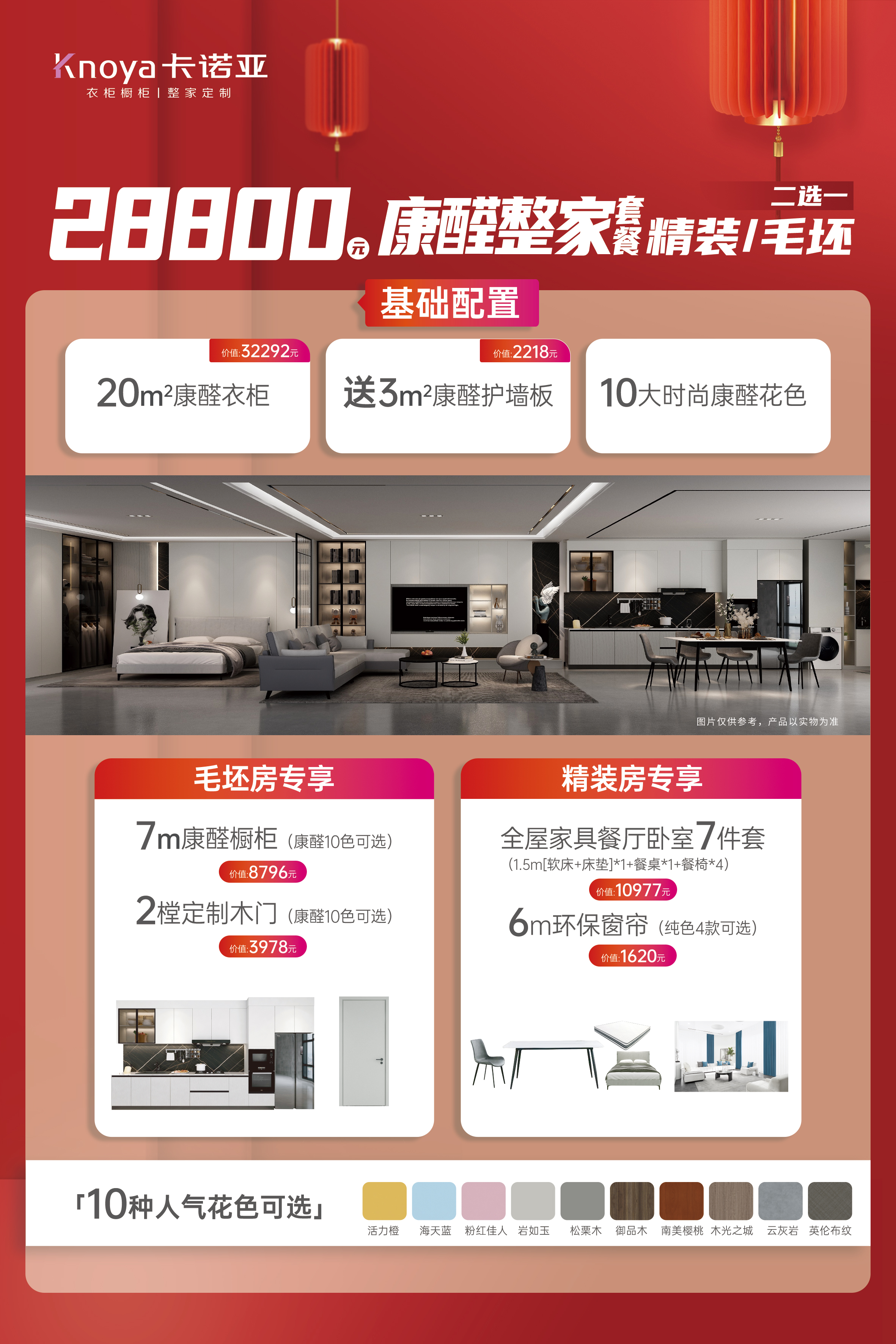 28800元康醛整家套餐=20㎡康醛定制柜+7m康醛櫥柜+2樘定制木門(毛坯房)或20㎡康醛定制柜+餐廳臥室7件套+6m窗簾(精裝房),再送3㎡背景墻,全屋標(biāo)配康醛板,花色再次升級為10大人氣花色,一個套餐就能將柜、墻、門等產(chǎn)品一站配齊,真正實現(xiàn)“一家搞定,拎包入住,省錢省心”。