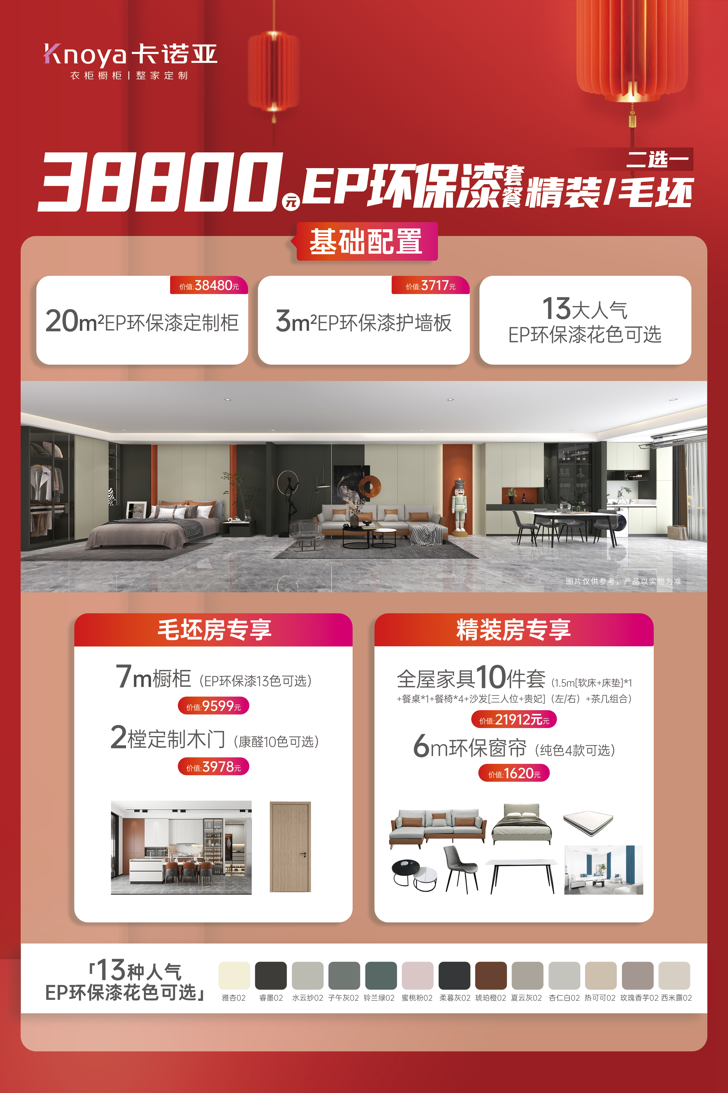 本次大促,除了一直在推出的28800元康醛整家套餐,還重磅推出了38800元EP環(huán)保漆整家套餐,分別針對毛坯房和精裝房配置了不同的套餐內(nèi)容,買套餐再送3㎡背景墻,并且將柜墻門一體化理念貫穿到整家套餐之中,讓消費者買得實惠、裝得省心、住得舒適!