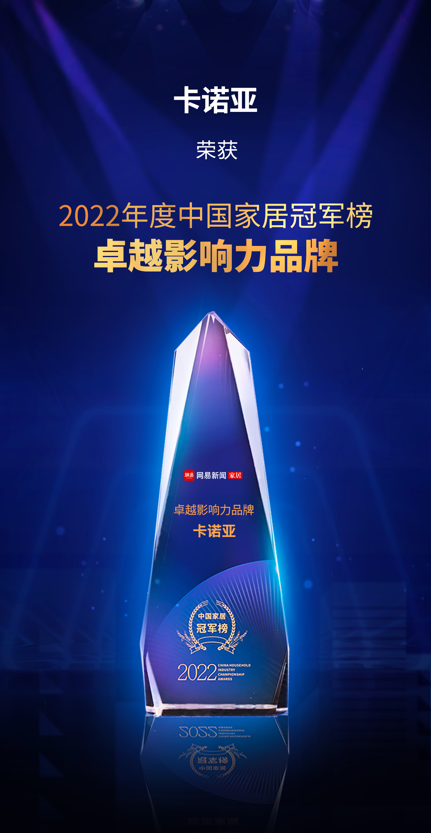 2022網(wǎng)易中國家居冠軍榜,旨在對本年度中國家居產(chǎn)業(yè)有著卓越成就和杰出貢獻(xiàn)的家居品牌和人物予以表彰,遴選行業(yè)有態(tài)度的實力榜樣,激發(fā)優(yōu)秀品牌和人物的引領(lǐng)作用,推動行業(yè)健康蓬勃發(fā)展。本次盛典發(fā)布2022年度中國家居冠軍榜“卓越影響力品牌”、“年度領(lǐng)軍人物”等十大重磅獎項,甄選行業(yè)優(yōu)秀標(biāo)桿,見證行業(yè)冠軍能量??ㄖZ亞作為家居行業(yè)的佼佼者,眾望所歸獲得“卓越影響力品牌”、“年度領(lǐng)軍人物”雙獎,持續(xù)引領(lǐng)行業(yè)高質(zhì)量前行。